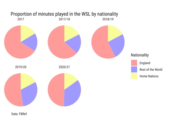 To a certain extent, that has been true. Even though the number of players from abroad has not gone up significantly, there has been a steady increase in the proportion of minutes played by those players over the past five seasons. However, roughly half of all minutes in the WSL this season have still been played by English footballers.
