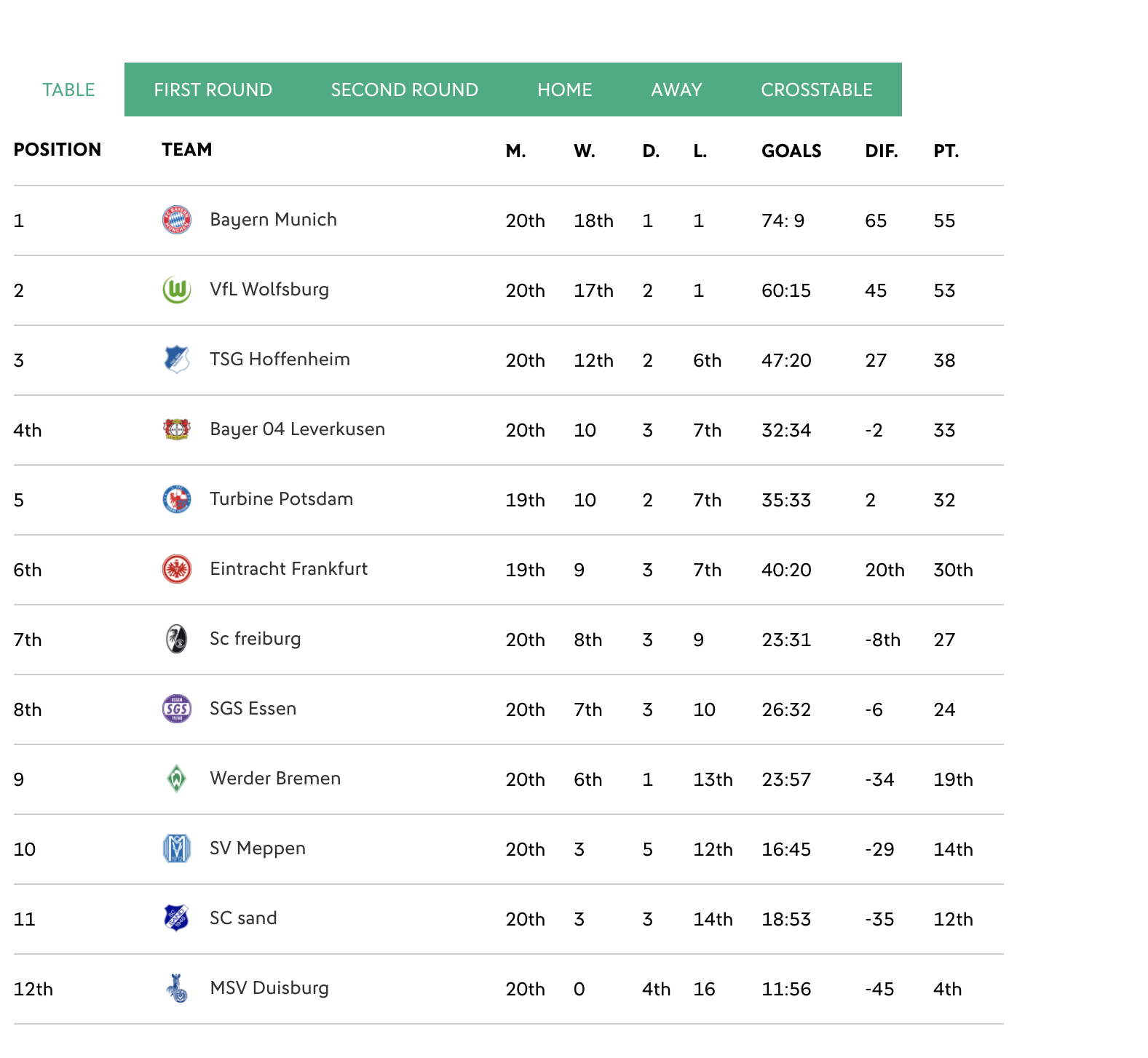 Currently, the leaders have scored 74 Frauen-Bundesliga goals, whilst Wolfsburg has only managed to record 60.