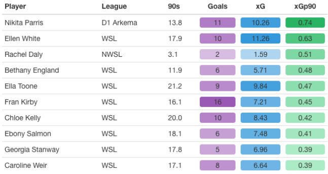 In terms of attackers, however, it is undeniable that Riise has picked the most effective. Using Wyscout data we can see that Nikita Parris and Ellen White have been the best British performers in terms of xG per 90. Rachel Daly’s numbers are a bit misleading due to the fact that the NWSL season has only just begun but her performances for the Houston Dash over the past years should be more than enough reason for Riise to consider her as a striker first and foremost. Her listing as a defender, however, suggests we are unlikely to see her get minutes up front.