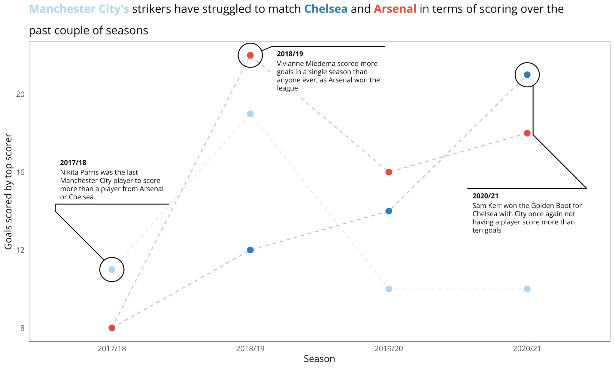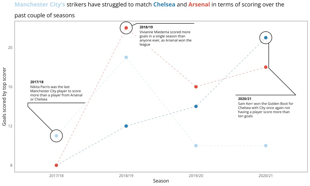 On the face of it, Manchester City have not had a problem with scoring. Their 2.95 goals per game average this season was the highest it had been in the WSL. Yet this average hides the matches where Manchester City really struggled. A 0-0 draw with Brighton and a 1-1 draw with Reading at the start of the season, where they underperformed their xG in both games, saw them already left with a points deficit that proved insurmountable in the league. An injury to Chloe Kelly and the departure of Sam Mewis has also seen them lose what amounted to 17 goals last season. It is clear that goal scoring is an area Manchester City needed to strengthen.