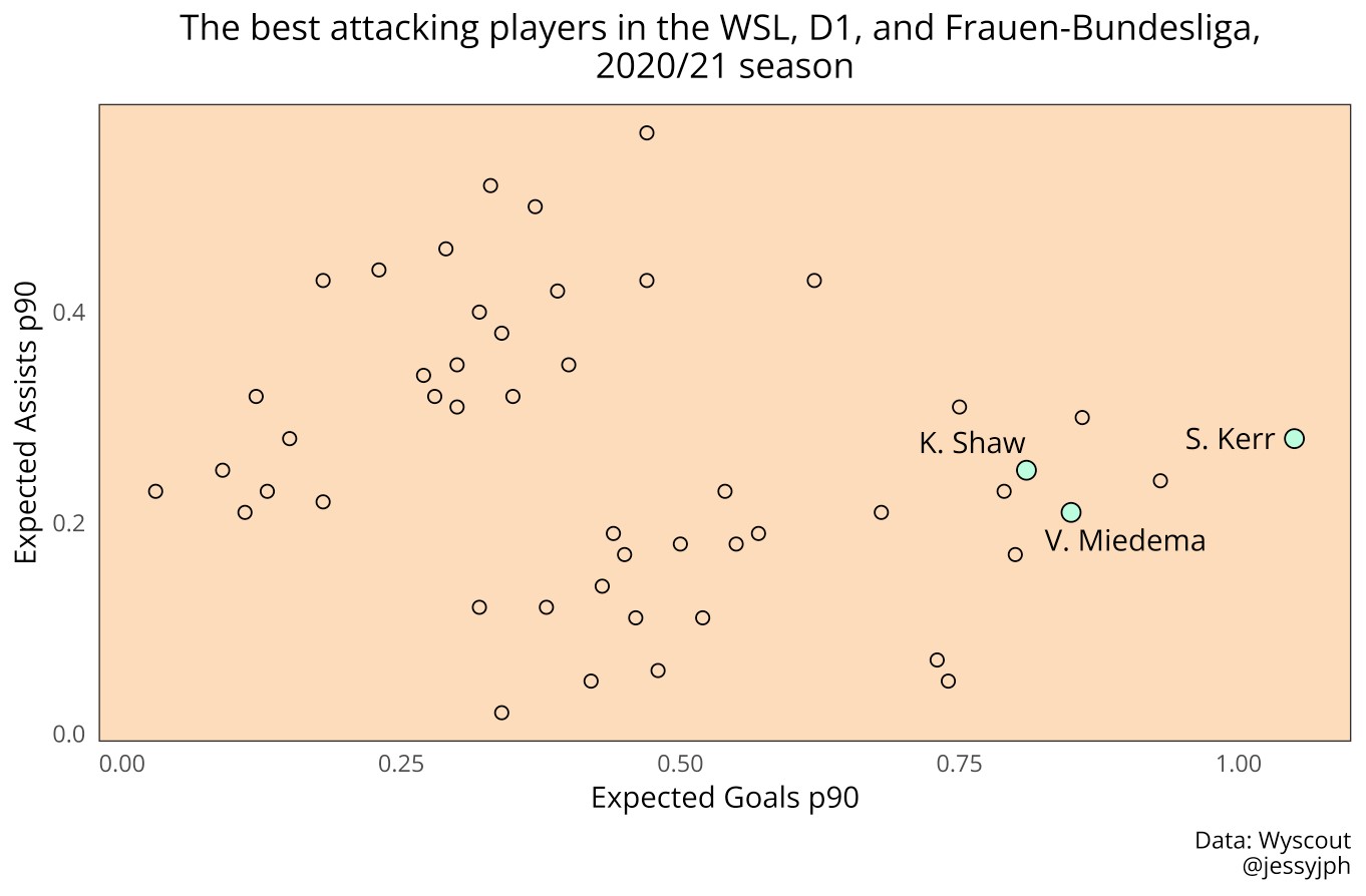 There are a lot of similarities between Shaw’s style of play and Ellen White’s. Both like to play on the shoulder of the last defender and are exceptional at poaching balls in the penalty area. Khadija Shaw’s xG per shot last season was 0.22, very similar to Sam Kerr’s 0.21 per shot. This shows that Shaw likes taking high value shots where she is more likely to score. By comparison, White’s was 0.15 which still put her in the top 20 in the WSL last season.