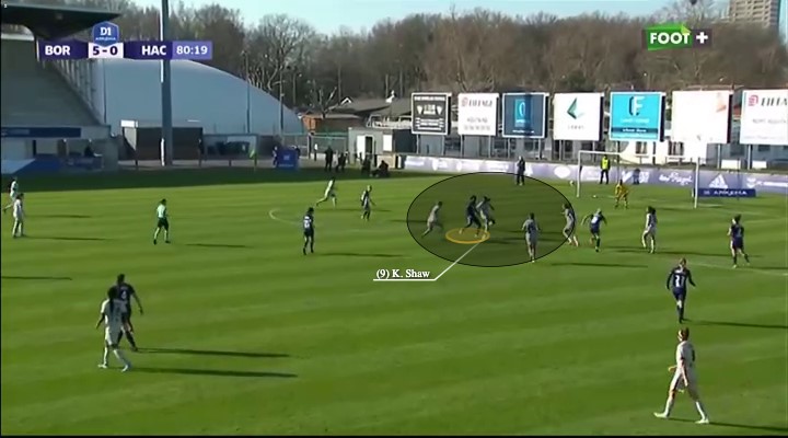 The fear of Shaw can also open up space for other players to make runs as can be seen here. As Shaw receives the ball, four opposition players close in around her, freeing up the space for a teammate to make a clear run through on goal. Shaw is then able to play her in to score.