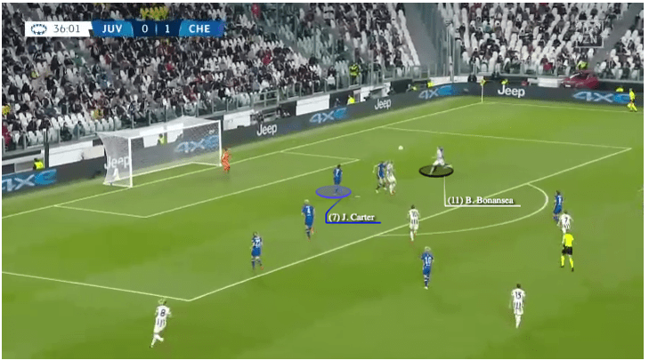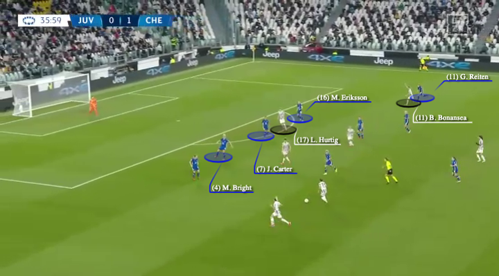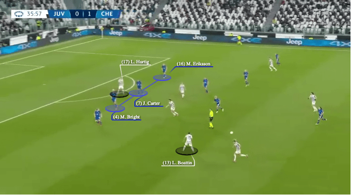 But Carter allows Hurtig to drift in behind her, leaving Magda Eriksson to pick her up. Now there are two Chelsea central defenders picking up no one, whilst Barbra Bonansea has started her run ahead of Guro Reiten.