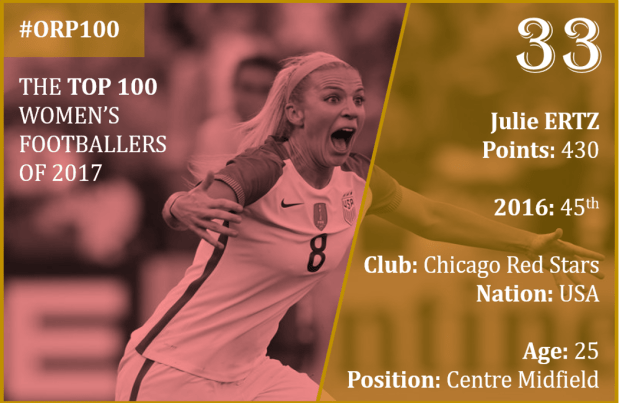 A change of name in 2017, but no change in form for Chicago and USA star Julie Ertz. Like Ji before her, another player only just reaching her peak years yet excelling for club and country.