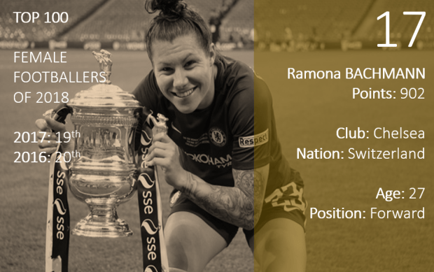 Bachmann might not be the most prolific, but her work ethic and ability to create are among the reasons she is so highly rated within the game. She did not score a league goal in the second half of the 2017-18 season but saved her best for the FA Cup final, where she was unplayable. Her two goals against Arsenal at Wembley played the biggest part of all in helping Chelsea lift the trophy. While her tenacity, intensity and passion make her the player she is, she could do little for Switzerland as they were swept aside by the Netherlands in the European play-off for a World Cup spot.