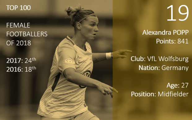 Popp squeezes into the top 20 this year thanks to her role in Wolfsburg’s title success and run to the Champions League final. While she is not a regular goalscorer, her five assists in the second half of 2017-18 showed what a creative influence she is – and that was underscored by the two goals she set up during her side’s Champions League semi-final against Chelsea. Five goals for Germany also ensured a successful year on that front but unfortunately Popp may be best remembered for her red card in the Champions League final while Wolfsburg were leading 1-0 in extra time, allowing Lyon to go on and win the title.