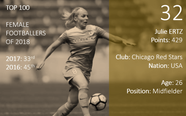 Now one of the most talented and consistent midfielders in the game, Ertz has enjoyed an impressive 2018. She did not score for Chicago during the NWSL campaign but played a key role in helping her side reach the play-offs. International duty ensured a stop-start feel to her season but she popped up with goals for USA against Brazil, Mexico and in a World Cup qualifier against Jamaica during their unbeaten year.