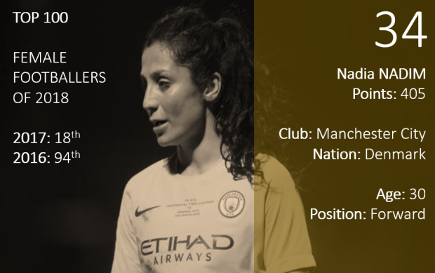 It has been a chalk and cheese year for Nadim, whose form for Denmark keeps her in a good position. She joined Manchester City in January and started with plenty of promise, scoring minutes into her debut and following that with the winner against Chelsea in the WSL Cup semi-final. But a transfer request and struggle for form have been the unhappy backdrop of a slow start to 2018-19 in which Nadim has failed to score a WSL goal. Seven goals for Denmark – including a play-off strike against the Netherlands – have rescued her year.