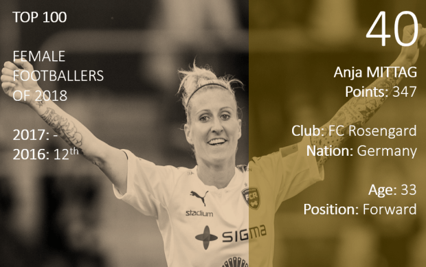 Club responsibilites were Mittag’s sole focus in 2018. She retired from international duty with Germany last year and the impact on her form for Swedish club Rosengard has been positive. She scored 17 league goals and six more in the cup, proving that her eye for goal has not dissipated, although defeat to Gothenburg on the final day denied Rosengard both the title and a Champions League spot. There was personal consolation for Mittag in the form of the Damallsvenskan golden boot.