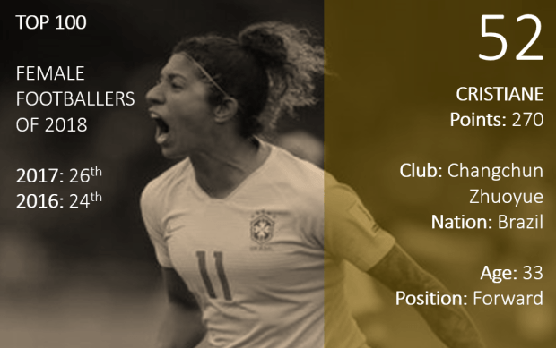 One of the most talented and creative forwards in the game, Cristiane has virtually removed herself from the public eye by moving to China to play for Changchun Zhuoyue. Six goals so far in the domestic competition – plus four for Brazil as her country won the Copa América Femenina – mean it has not been a bad year though, and she has still been able to show her creative ability in a league to which an increasing number of well-known players are heading. At 33, France 2019 may be her last chance to star on the big stage.