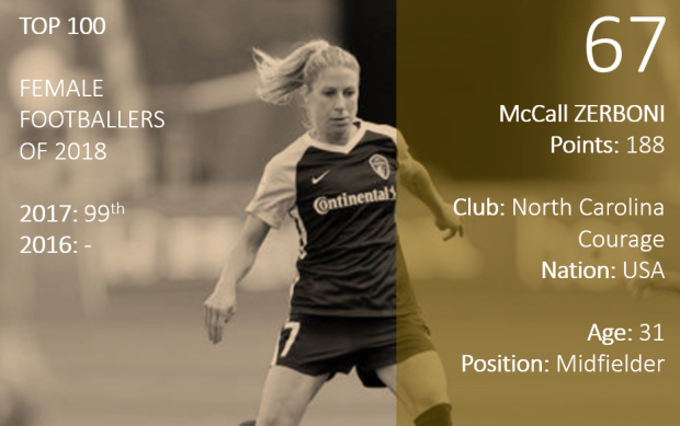 An otherwise successful year for Zerboni was sadly curtailed by injury. She played a pivotal role for North Carolina Courage during their march towards the NWSL title but then fractured her elbow in USA’s friendly against Chile and did not play again beyond September. The midfielder enhanced her reputation in 2018, popping up with three domestic goals, but she has always been more highly valued for her all-round qualities. After making her international debut at the end of 2017, she made another seven appearances at that level this year.