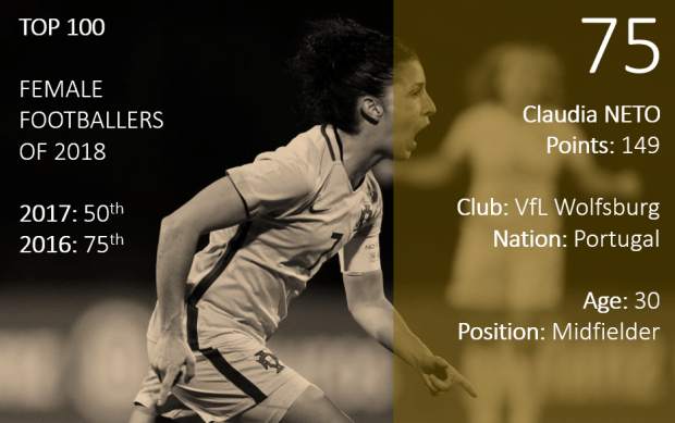 Neto falls down the rankings this year and it would have been easy for her to disappear completely given the level of competition at her new club, Wolfsburg. But she held down a fairly regular spot, proving her quality in the middle of the park, and played an important role in their domestic double even if she has not yet scored for the German giants. She was ineligible for the Champions League last season, which had a positive impact on her number of starts in the Bundesliga. The Portugal talisman helped her country during a strong showing at the Algarve Cup, but even she could not secure them a place at next summer’s World Cup.