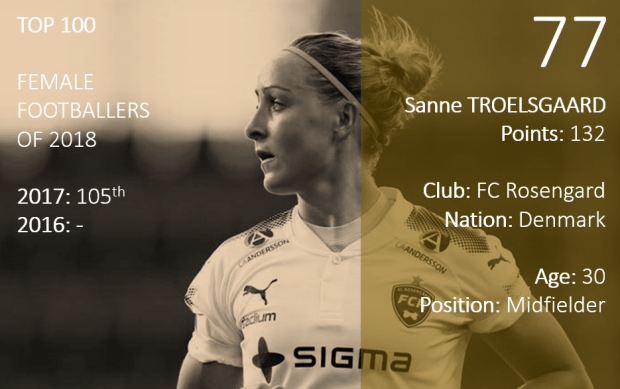 Troelsgaard just missed out on last year’s top 100 but her form for Rosengard and Denmark ensured she could not be ignored this time around. While her club endured final-day heartbreak in the league despite the 30-year-old’s eight goals, she proved decisive in the cup. Her winner against Linköping landed Rosengard the trophy and she performed well for her national team too. Four goals at international level capped an impressive 2018 and it is a shame that her talent will not be on show at next year’s World Cup.