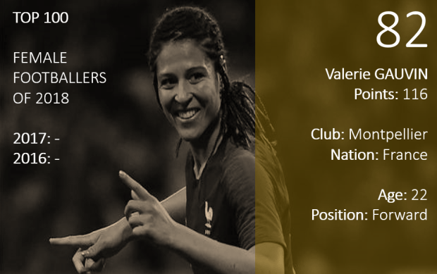 Gauvin has had a stop-start year but makes the top 100 for the first time. She did little wrong domestically for a Montpellier side that underperformed at times. Seven goals, including recent strikes against Lyon and Paris FC, show she knows how to produce in big games and she is becoming a more regular part of Corinne Diacre’s France side, too. She followed a goal against Germany with a hat-trick in a friendly against Nigeria.