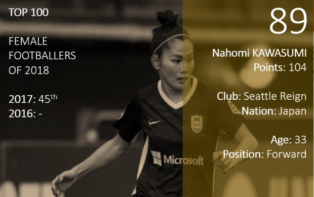 Kawasumi failed to find the net for club or country this year and her importance to Seattle has dwindled under Vlatko Andonovski. But she is still a quality performer, her three assists in limited starts showing glimpses of what “Naho” is still able to do. She remained a regular for Japan and played a big part for the Nadeshiko as they beat Australia to claim the Asia Cup. Additionally she was a regular at the Tournament of Nations, overall doing just enough to keep her in the top 100 this year.