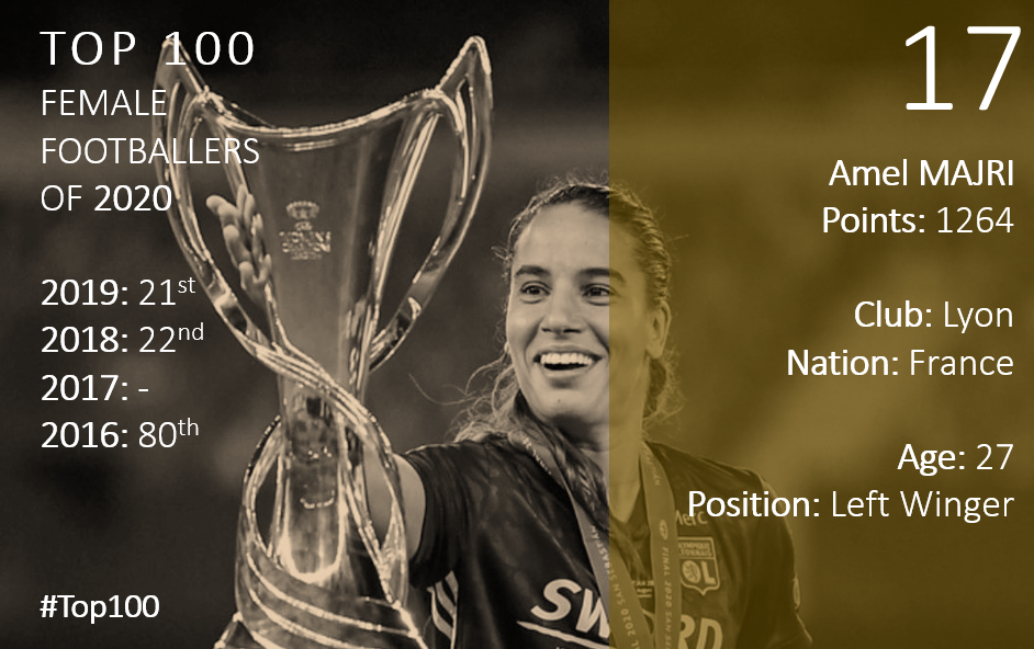 There’s every argument to be made that Amel Majri has performed at a high enough level now for several years to be called the best left winger in the world. After a few years having to often fill in at full-back, Sakina Karchaoui’s arrival has allowed Majri to fully concentrate on her attacking duties. A great passer and a great crosser, Majri has the pace and agility to run at her markers and has all the necessary qualities which make her a deadly winger. Majri already has three assists for Lyon this season and is capable of chipping in with goals, scoring five through the year which ranks her highly as one of the top scoring full-backs anywhere in Europe. After finishing 21st and 22nd in the last two years, Majri rightly finally breaks into the top 20.