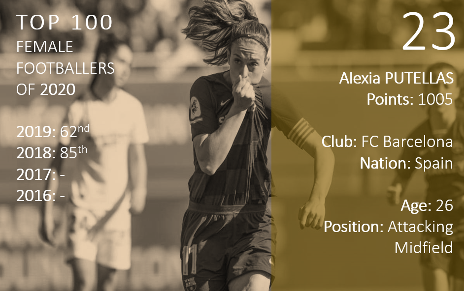 After two years outside the top 50, Putellas deservedly makes a big jump this year after a superb 2020. There is no doubt Putellas is now one of the best midfielders anywhere in the world, with the ability to dominate but also get forward and contribute directly herself. While she ranks as one of the best for creating chances for others, no other centre midfielder had more shots on target than the Barcelona player during 2020. Putellas simply has a bit of everything and she’s consistently chipping in with goals too, already firing home four this season as well as a couple of assists. A key player for Spain too, Putellas really could forge herself the reputation as one of the very best over the coming years.