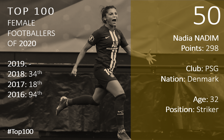 Nadia Nadim returns to the top 100 and indeed the top 50 this year after enjoying somewhat of a renaissance with French giants PSG. After a frustrating spell at Manchester City, Nadim hit good form early in 2020 before the league was postponed prematurely, but hasn’t allowed the spell with no football to hinder her good form. Nadim already has seven goals in six games in France this season, albeit with six of them coming in an incredible one game blitz against Issy in the league. Even if it unbalances her record somewhat, her form in front of goal is shown to be no fluke when looking at her international record, with five goals in her last few games for Denmark including two in an important 3-1 win over Italy.