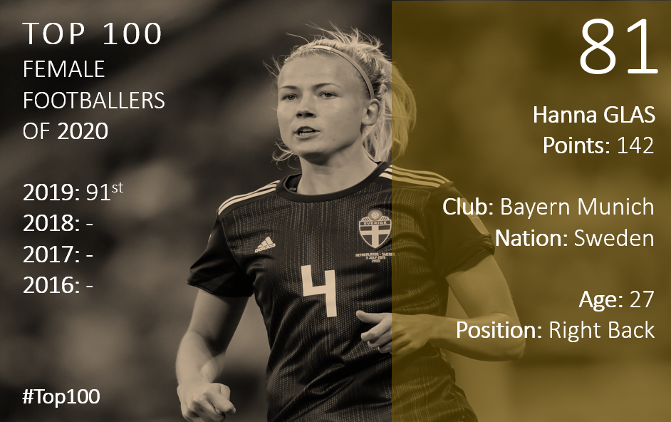 Hanna Glas moves up to ten spots this year and has asserted her position as one of the top full-backs in the world. With 14 chances created, Glas was in the top five for full-backs worldwide this year and her performances earned her a nomination for Swedish defender of the year. After impressing for PSG, Glas switched to Bayern Munich in the summer and has taken to life in the Bundesliga with no issues. Glas has started all eight of her games in the Bundesliga so far this season and popped up with a goal from full-back against SGS Essen.