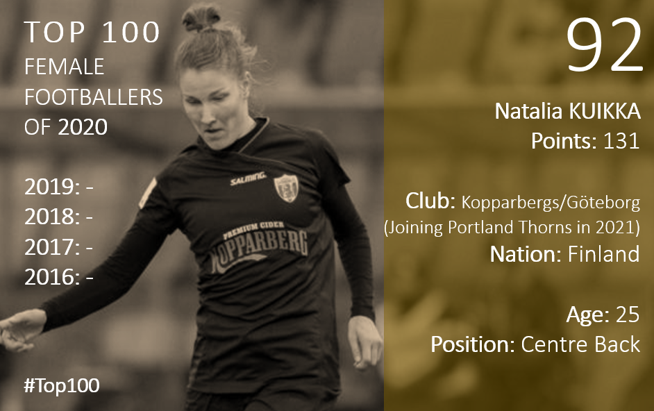 25-year-old centre-back Natalia Kuikka is undoubtedly one of the breakout stories of the year. While many eyes on the new Damallsvenskan champions Kopparbergs/Goteborg have focused on their forward line, Kuikka has brought a new dynamic to the team with both her defensive and offensive qualities. Named the Damallsvenskan defender of the year, Kuikka registered more shots on target than any other centre back in Europe in 2020 but also the most ball recoveries, somehow combining defence and attack like few other centre-backs can. Her importance in her team’s title success has earned her an eye-catching move to Portland Thorns for 2021.