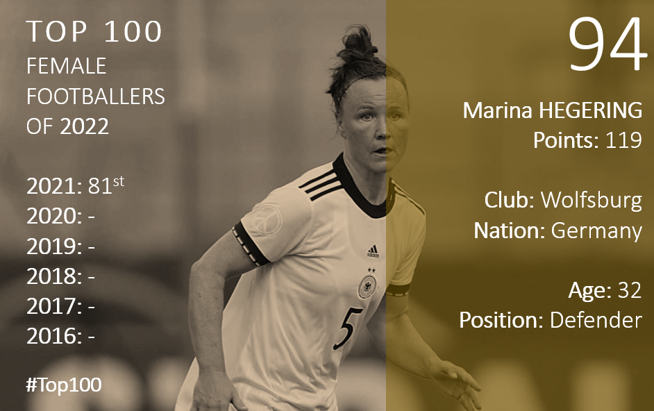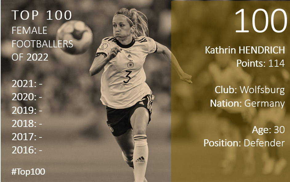 Hendrich has been ever present at the back for both Wolfsburg and Germany in 2022. She barely missed a minute of league action last season and has not missed a single one so far this term too. An experienced head with an abundance of defensive qualities, Hendrich was in great form for Germany, particularly during their run to the Euro 2022 final. Very few showed the heart and desire Hendrich had during the tournament and she played a huge role in her team’s success at both domestic and international level throughout this year – with that, she sneaks into the 100 for the first time.