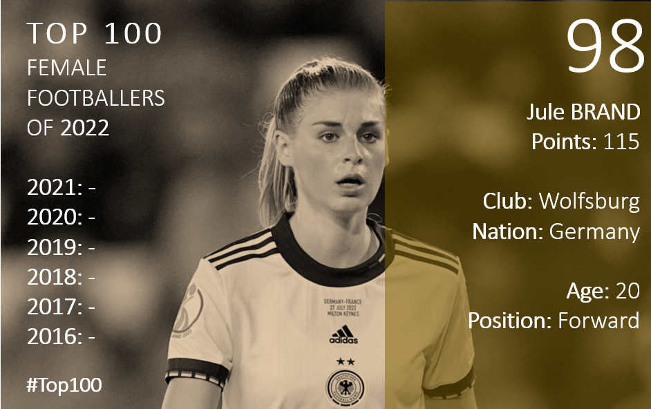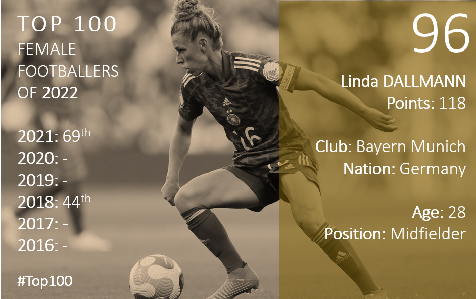 Dallmann drops to the edge of the 100 in 2022 but that says more about the rise of others around the world than it does about Dallmann herself. Her importance at club level has just been highlighted by a new long-term contract through to 2026 and she has started the season in great form. Already hitting five goals for Bayern, Dallmann is already close to her tally of seven from the whole of last season, and has grown alongside new signing Georgia Stanway. There is no doubt the midfielder has raised her game to another level early in this campaign.