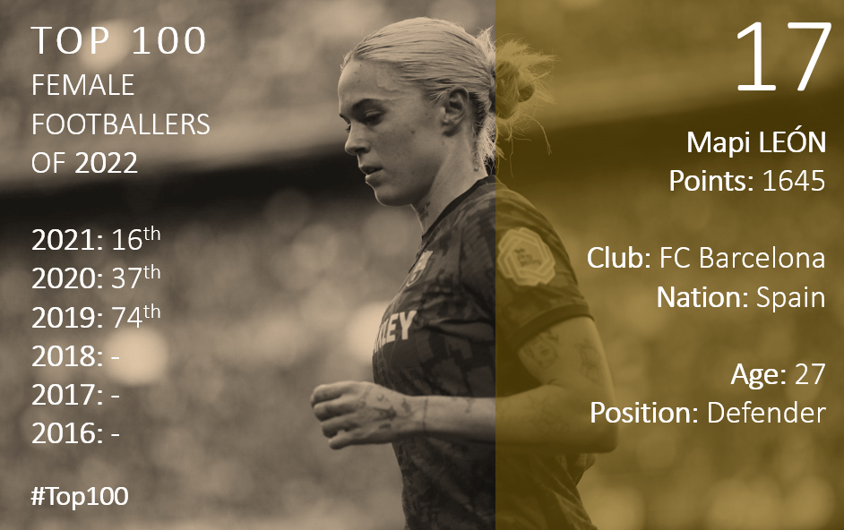 Coming in just one place lower than in 2021 emphasises the consistency León is continuing to show as one of the top defenders in world football. She is also one of the most attacking around, right at home in the all-conquering Barcelona side. The 27-year-old showed the ability she has to create with her wand of a left foot at the Euros, while recently in Liga F she has found the net with a couple of brilliant free-kicks. The ultimate modern centre-back.