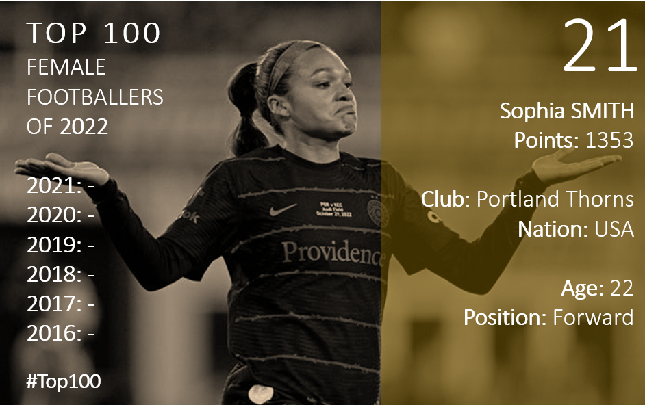 Sophia Smith is the highest first-time entrant into this year’s top 100, with three judges marking the forward’s immense rise by picking her as their No 1. She showed the world what she’s about this year, her 14 goals and direct forward play playing a huge role in the Portland Thorns clinching the NWSL Championship. Smith has been in devastating form throughout the year and is taking on a more prominent role in a new-look USA attack, earning the NWSL MVP award at just 22 for her performances in 2022.