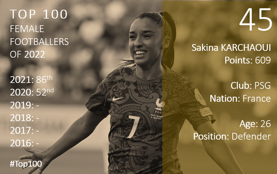 Karchaoui is among the big movers here in 2022, with her impressive performances catching judges’ eyes. Her peak came for France at Euro 2022 where she was exceptional at left-back, providing two assists and ending with a deserved place in the team of the tournament. Karchaoui epitomises the modern full-back, with her ability to defend not compromised by her willingness to attack and create chances, at both PSG and France. With stiff competition in the position at both, Karchaoui’s performances are keeping her in the starting lineups and she continues to grow into a top defender.