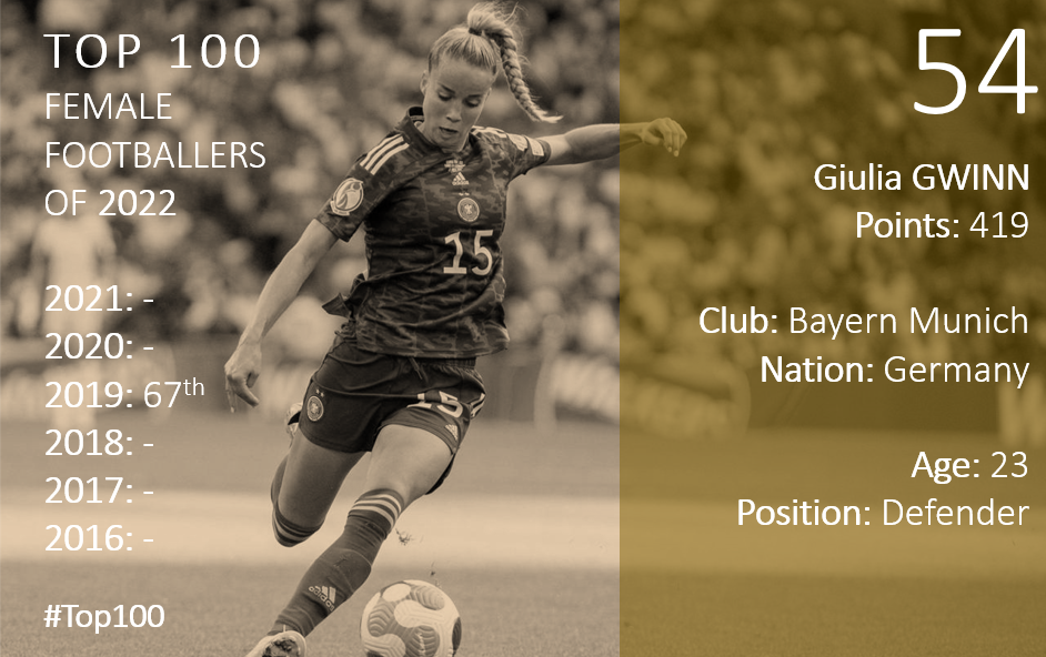 Gwinn’s superb year which sees her re-enter the top 100 in 2022 – she last made the list in 2019 – has been tough since she has suffered a second serious ACL injury which will likely rule her out for most of 2023. Gwinn returned from her first injury and quickly reminded everyone what she can do, particularly at Euro 2022 where she was exceptional for Germany in their run to the final. Her performance at Wembley was one which didn’t deserve to end up on the losing side. There’s every argument to suggest she was the best full-back at the tournament and her form for Bayern was excellent too, and her loss for both is a shame heading into another big year.