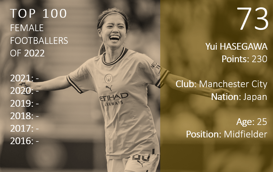 Perhaps it was the big summer move to Manchester City that has finally earned Hasegawa further appreciation within the game as the Japanese star breaks into the top 100 for the first time. Like many teammates at international level, her technical ability on the ball is there for all to see, albeit at times she is being asked to play a more defensive role for her new club, but Hasegawa has also shown she can get forward to score and create goals as she did for West Ham. It is refreshing to see such a talented player step up to one of Europe’s top clubs and show just how influential she can be on a team’s attacking play.
